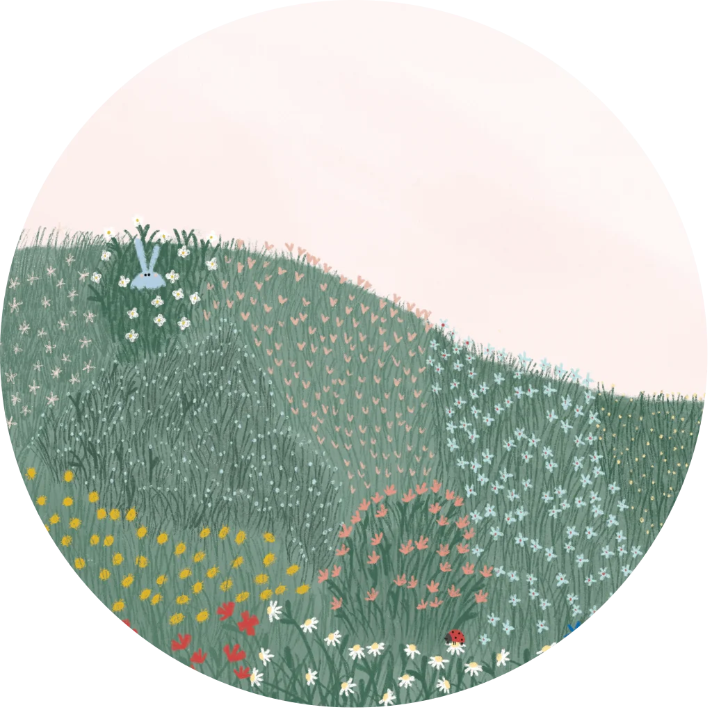 Een behangcirkel met een gezellige weide vol bloemen en lichtroze achtergrond.