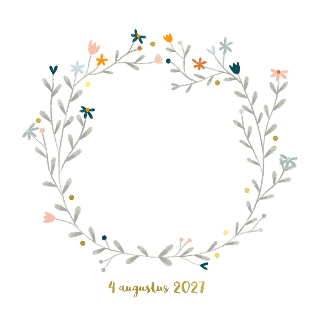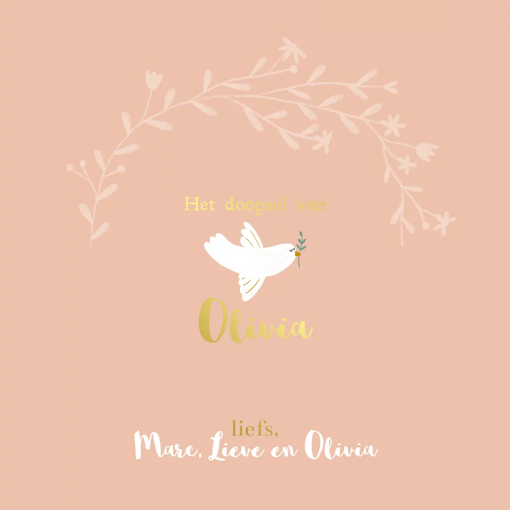 Een vrolijke doopkaart (of uitnodiging voor communie of lentefeest) met een bloemenkrans en een bijzonder doorkijkje naar een duifje en de naam van jullie kindje. Het stippellijntje aan de binnenkant wordt niet geprint maar is om te laten zien wat je ziet door de stans heen.