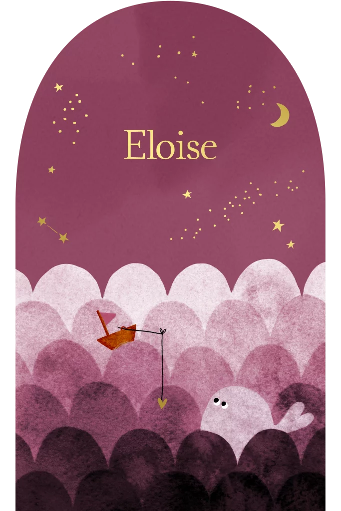 Wat een lief dromerig geboortekaartje met goudfolie sterrenhemel en waterverf illustraties van een oceaan en een nieuwsgierige walvis. Een lief zeilbootje met gouden hartje aan de hengel maakt het lieve kaartje helemaal af. Leuk voor jongens en meisjes!
