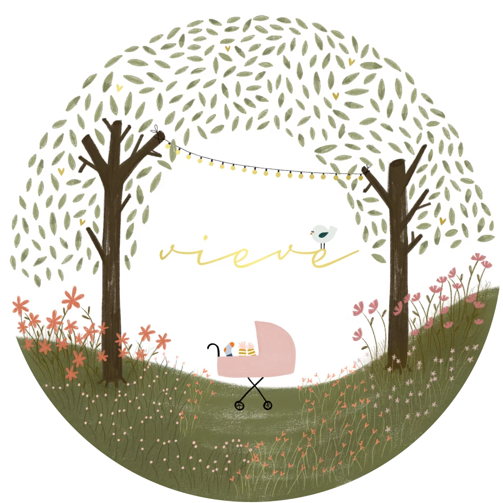 Een geïllustreerde romantisch geboortekaartje met een illustratie van bomen met een licht slinger ertussen in een bloemenweide. Je kunt zelf kiezen of je een wiegje of wandelwagen of iets anders tussen de bomen zet. De goudfolie op de kaart maakt het extra bijzonder! Pas de kleur aan van alle bloemetjes naar wens door op het elementje te klikken en daarna naar het kleurenpalletje te gaan.