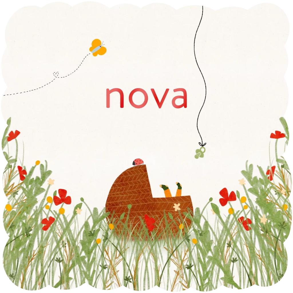 Een vrolijk zomers geboortekaartje in bijzondere vorm met heel veel veldbloemen zoals klaprozen en een schattig wiegje wat in het veld staat. Er fladderen en vliegen vrolijke diertjes omheen.