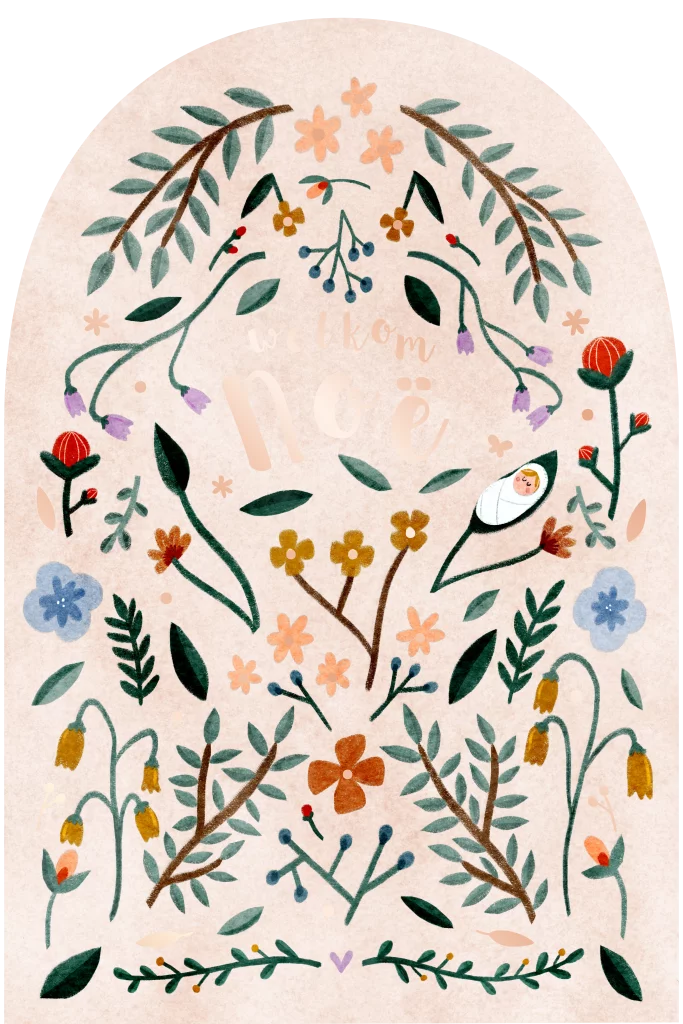 Een kleurrijk lief zomers geboortekaartje met een patroon van verschillende bloemen en takjes. Het originele formaat in boogvorm maakt dit kaartje helemaal af. Een mooi kaartje voor alle seizoenen, met het lieve detail van de kleine baby op het blaadje.