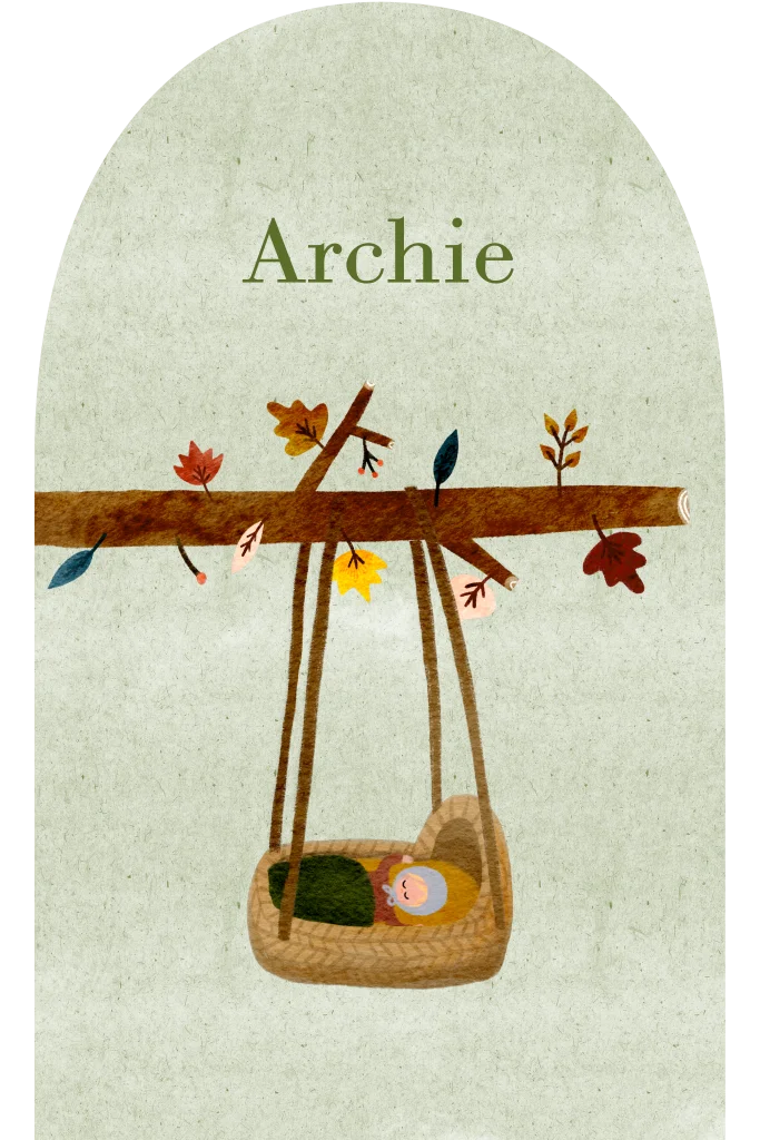 Een lief vrolijk herfst geboortekaartje met een illustratie van een wiegje hangend aan een tak met veel herfst blaadjes. Liever een ander formaat? Laat het even weten!
