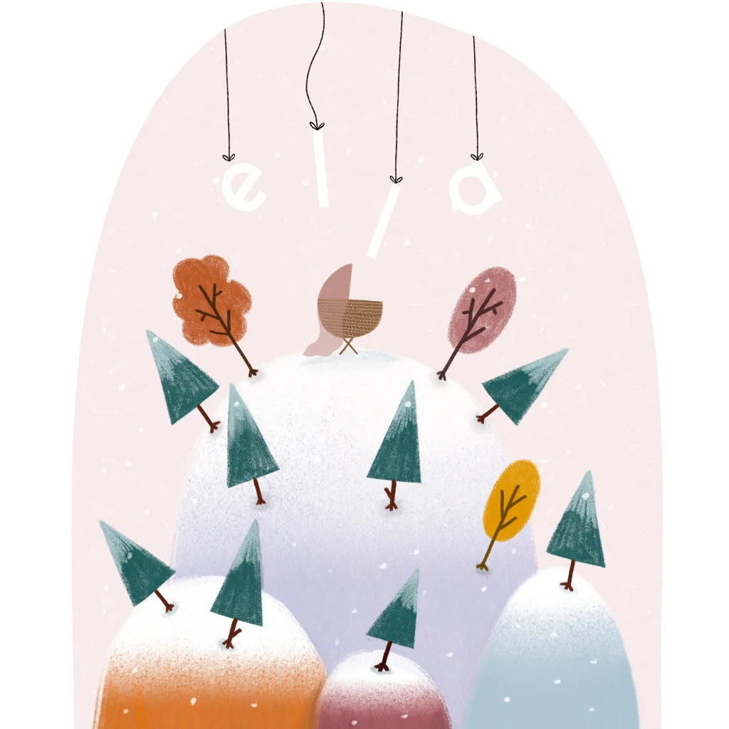 Een uniek geboortekaartje met een bijzondere boogvorm, in zachte kleuren zoals lila en oudroze, met een avontuurlijke illustratie met kleurrijke bergen, boompjes en bovenop een schattig wiegje. Voeg zelf nog sneeuwpopjes, bosdiertjes of andere kindjes toe.