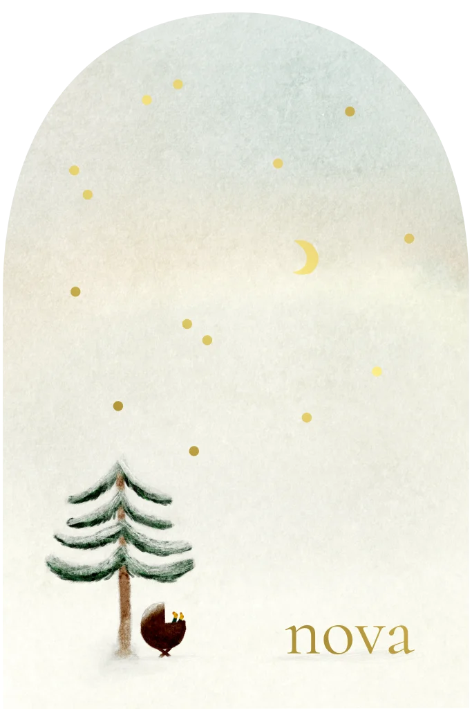 Een winters minimalistisch geboortekaartje met gouden sterren en een maan met winterse sneeuw achtergrond en een lief wiegje onder een boom.