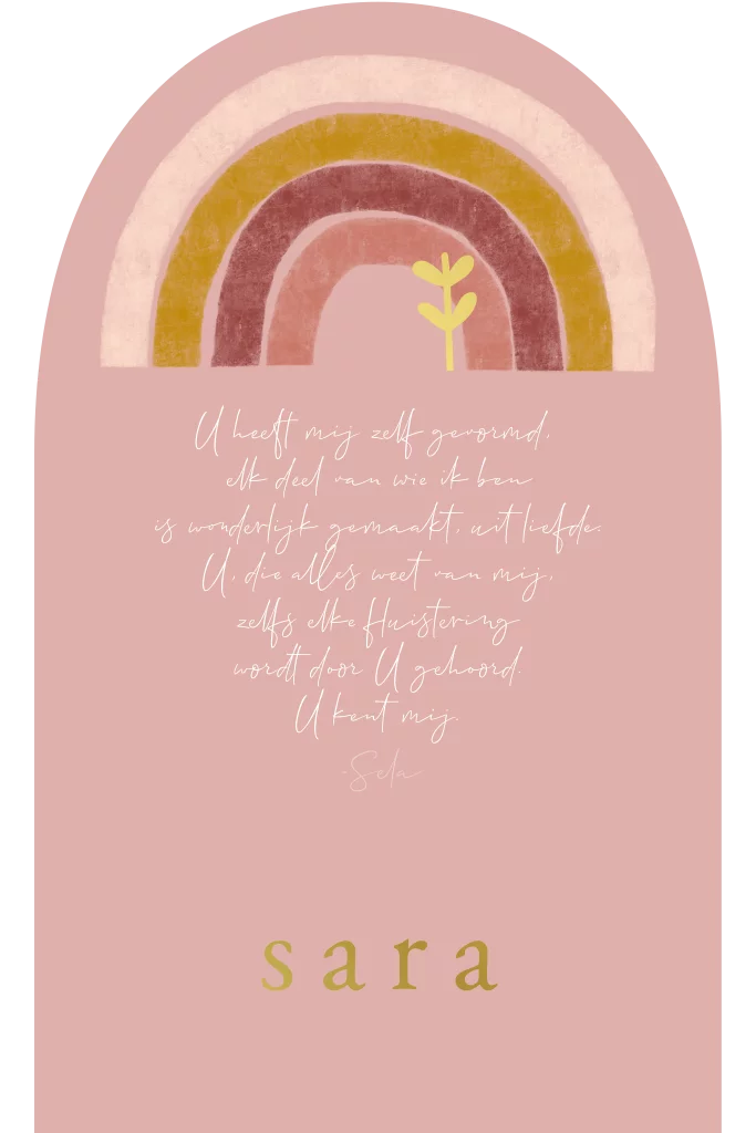 Een lief rustig christelijk geboortekaartje met een illustratie van een regenboog en goudfolie plantje. Er is veel ruimte voor een mooie (bijbel) tekst op de voorkant.