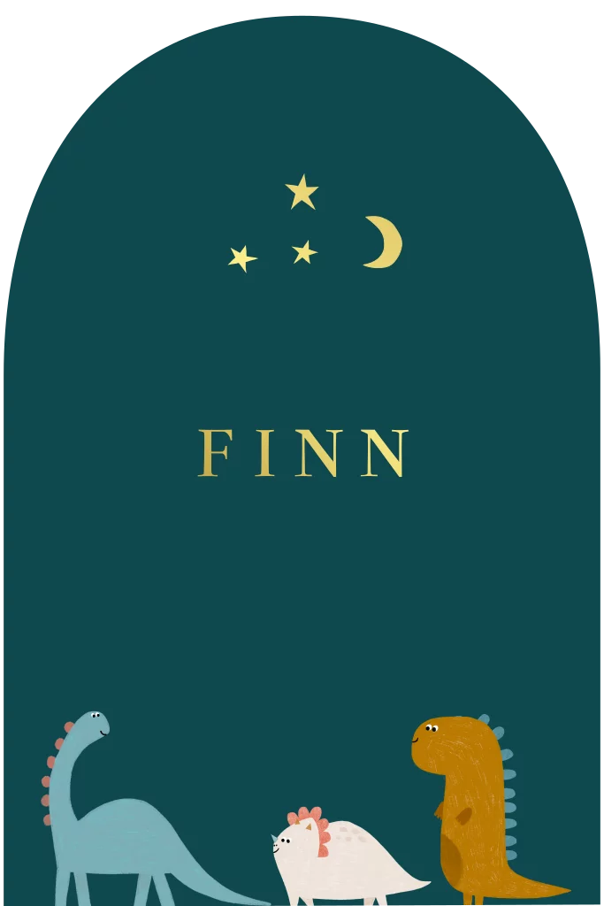 Een lief avontuurlijk geboortekaartje met dino's en een kleine sterrenhemel en maantje met goudfolie. Het kaartje heeft een bijzondere vorm.