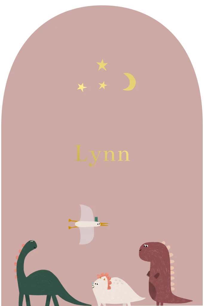 Een lief avontuurlijk geboortekaartje voor een meisje met dino's en een kleine sterrenhemel en maantje met goudfolie. Het kaartje heeft een bijzondere vorm.
