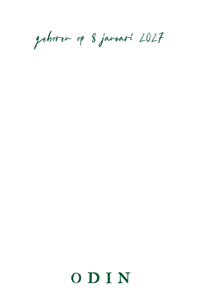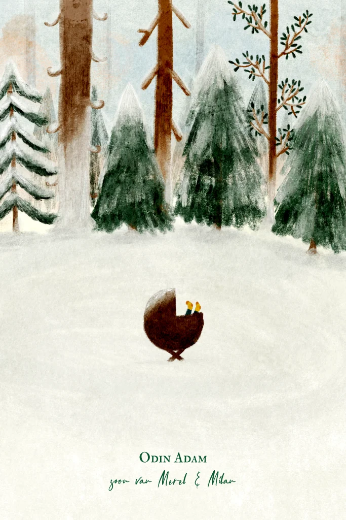 Een rustig geboortekaartje met een een doorkijkje naar de binnenkant van het kaartje. Daar zie je een geïllustreerd winterlandschap met een bos vol sneeuw en een schattig wiegje. Aan de binnenkant staat een stippellijntje waar het doorkijkje op uitkijkt, dit wordt niet afgedrukt.