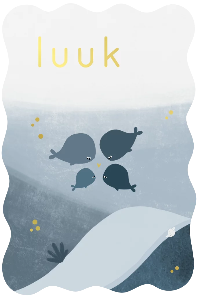 Een prachtige onderwaterwereld op dit geboortekaartje in bijzondere golfvorm. Een gezin van walvissen kijkt naar het nieuwe broertje of zusje.