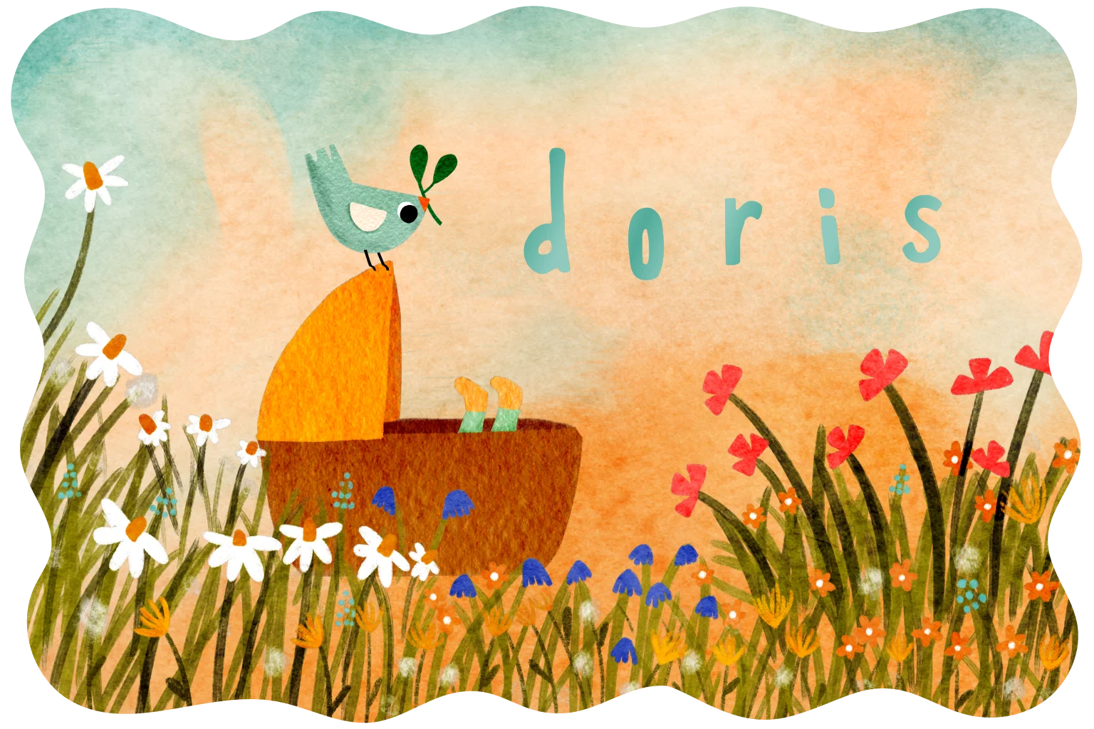 Een lief vrolijk geboortekaartje, met de lucht van een ondergaande zon en vrolijke wildbloemen. Een vogeltje komt even kijken bij het wiegje. De naam staat in hoogglans maar die kun je natuurlijk helemaal aanpassen naar wens.