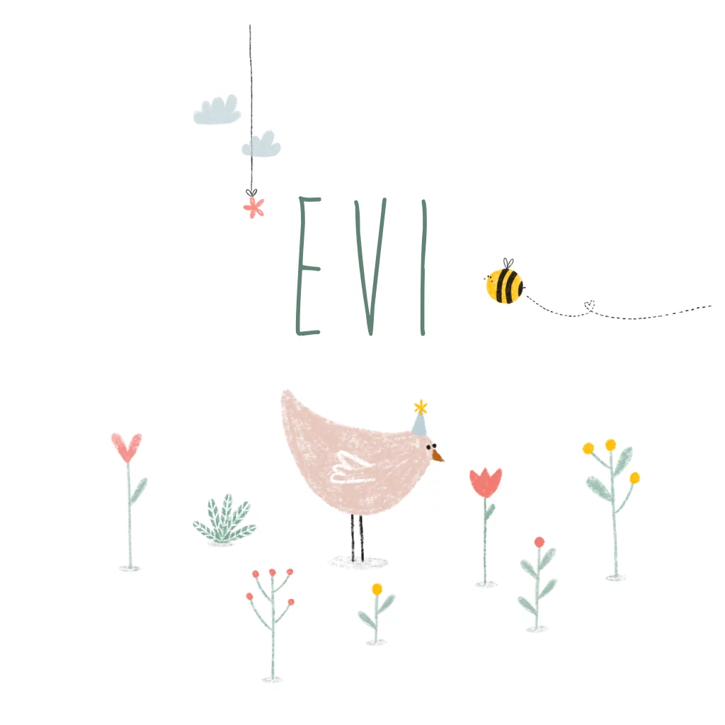 Een lief geboortekaartje in cirkelvorm met een illustratie van een vrolijke kip en een lief bijtje, met bloemetjes.