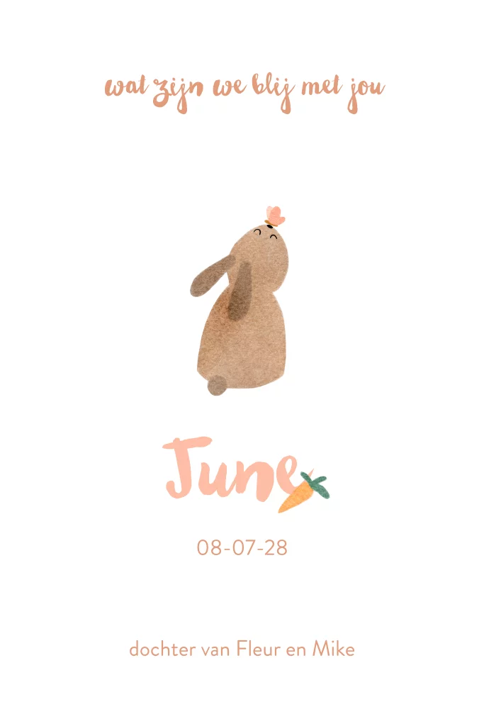 Een vrolijk geboortekaartje met een doorkijkje naar de binnenkant van het kaartje, waar je een vrolijk konijntje met een vlinder op de neus ziet. De buitenkant is versierd met lieve roze ruitjes. Pas zelf de kleuren aan naar wens! Aan de binnenkant staat een stippellijntje waar de stans komt, dit wordt niet afgedrukt.