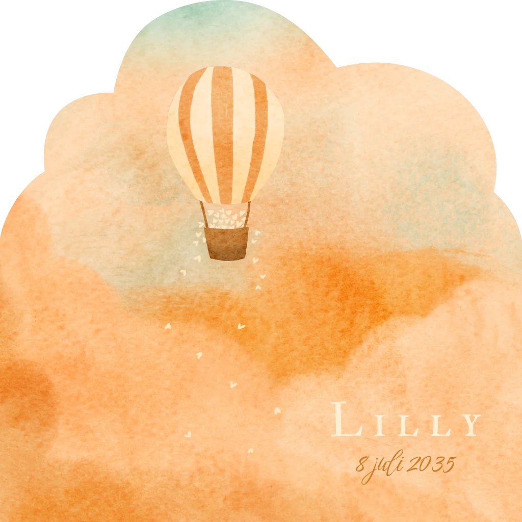 Een prachtig dromerig geïllustreerd geboortekaartje met een illustratie van een prachtige waterverf lucht vol kleuren, waar een luchtballon rondzweeft waar kleine hartjes uit vallen. Perfect voor een lief meisje of jongetje, een neutraal unisex geboortekaartje.