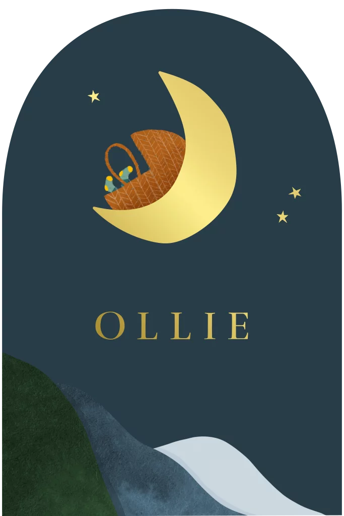 Een lief geboortekaartje met een illustratie van een mozesmandje met baby, die ligt in een goudfolie maan, boven een landschap van groen en blauw. Het kaartje heeft een bijzondere boogvorm.