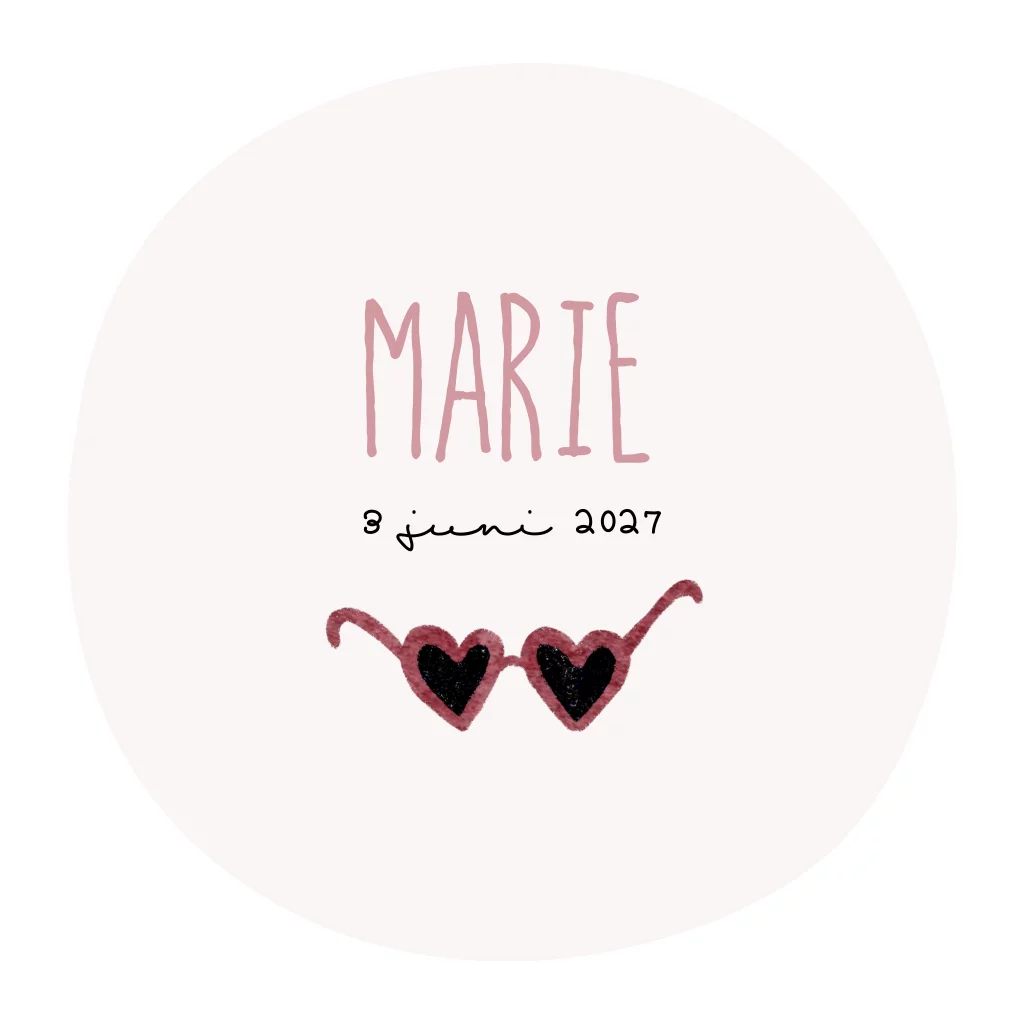 Een lief geboortekaartje in een ronde vorm met een minimalistische vormgeving, met een hartjes zonnebril. Liever andere kleur bril? Laat het even weten!