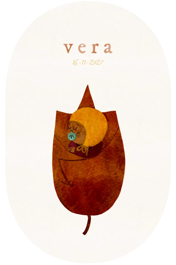 Een minimalistisch lief geboortekaartje met een kleine baby met donkerbruine huidskleur, die knus aan het slapen is in een wikkeldoek, gemaakt van een herfstblaadje. Perfect voor herfst baby's! Dit kaartje bestaat ook in andere huidskleuren. Liever toch aangepast naar een andere kleur? Mail eventjes!