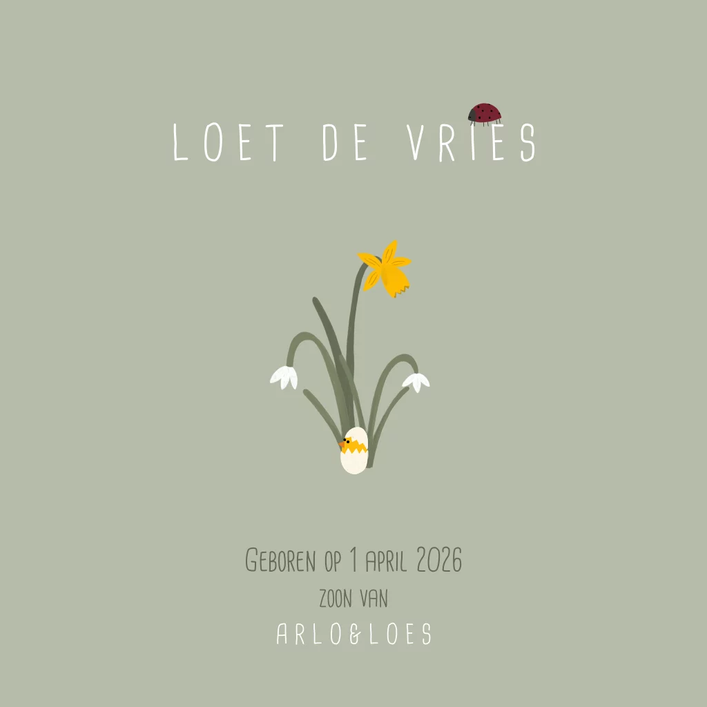 Een lief geboortekaartje met een gestanst doorkijkje, met een illustratie van een kuikentje en lente bloemetjes.