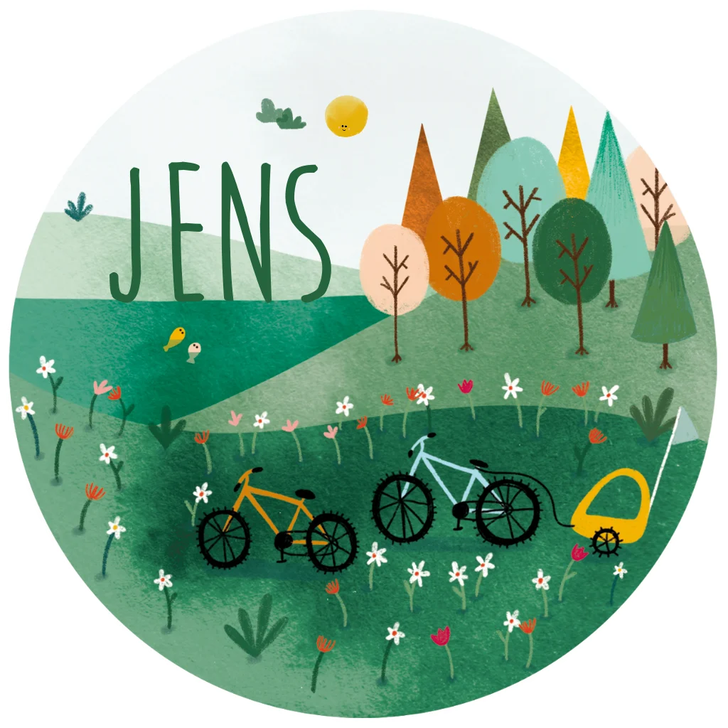 Een gestanst uniek geboortekaartje in de vorm van een rondje met een lief landschapje met bergen en bomen. Voor echte avonturiers en fietsliefhebbers!