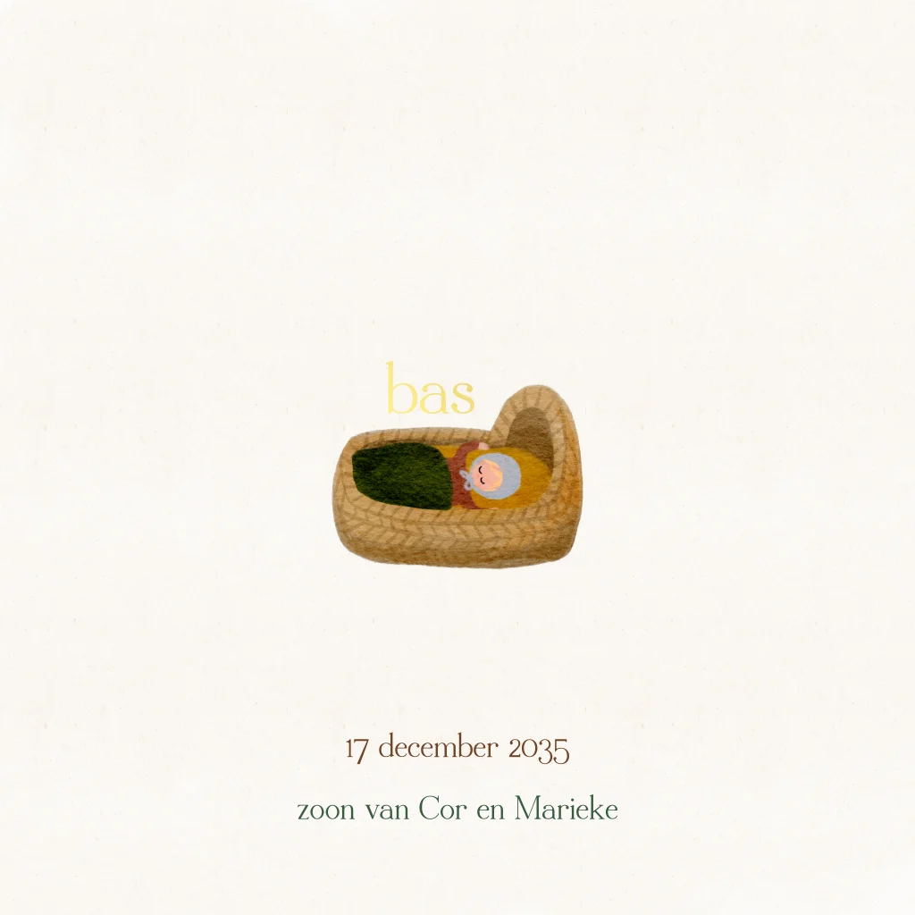 Een lief rustig geboortekaartje voor de geboorte van jouw kindje. Het geboortekaartje heeft op de voorkant een winterkrans van dennengroen en een lief doorkijkje naar een baby in een wiegje. Goudfolie maakt het kaartje helemaal af. Pas het kaartje eenvoudig naar wens aan en bestel een proefdruk om dit kaartje in het echt te bekijken.