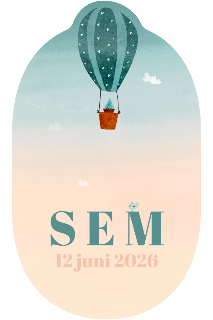 Een unieke geboortekaart met waterverf illustratie van een luchtballon met een wiegje erin. Op de achtergrond een prachtige waterverf achtergrond van een lucht vol kleuren van de zonsondergang. Het kaartje heeft een unieke originele vorm.