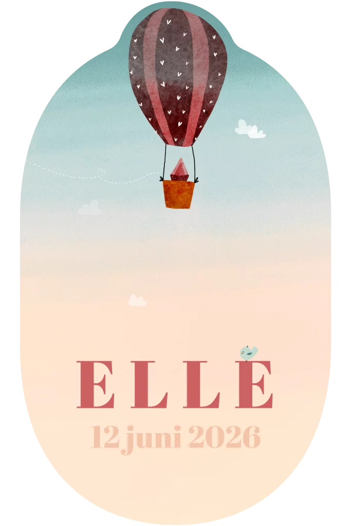 Een unieke geboortekaart met waterverf illustratie van een luchtballon met een wiegje erin. Op de achtergrond een prachtige waterverf achtergrond van een lucht vol kleuren van de zonsondergang. Het kaartje heeft een unieke originele vorm.
