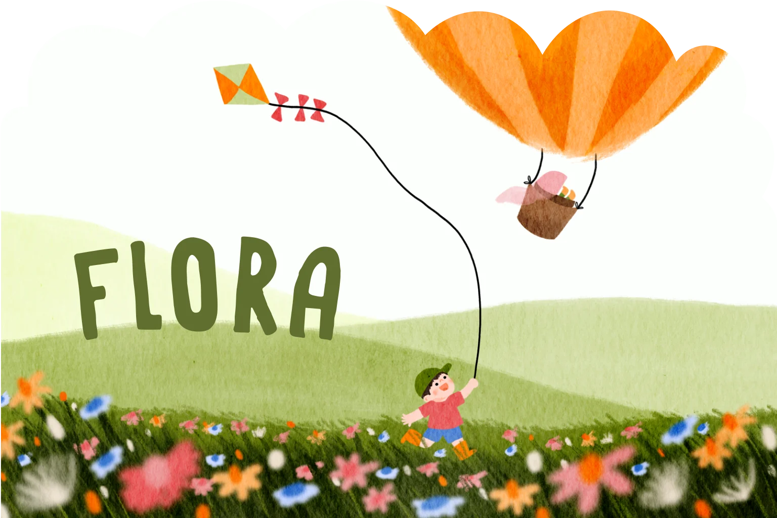 Een vrolijk lief geboortekaartje in originele wolken vorm met een grote broer die door een bloemenveld rent met een vlieger, achter een luchtballon aan waar zijn kleine zusje in een wiegje in rond zweeft. Wil je iets aangepast zien, bijvoorbeeld huidskleur of haarkleur? Mail even!