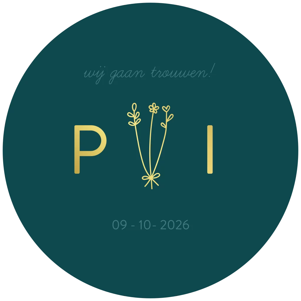 Een rustige trouwkaart in een bijzondere cirkel vorm, met een goudfolie boeketje van lieve bloemen en initialen.
