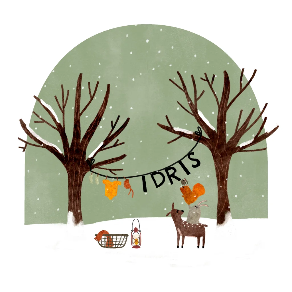 Deze winterse geboortekaart heeft een illustratie van een besneeuwd bos met een hert, eekhoorn en konijntje. Ze hangen de was op, met een schattig mutsje en sokjes.