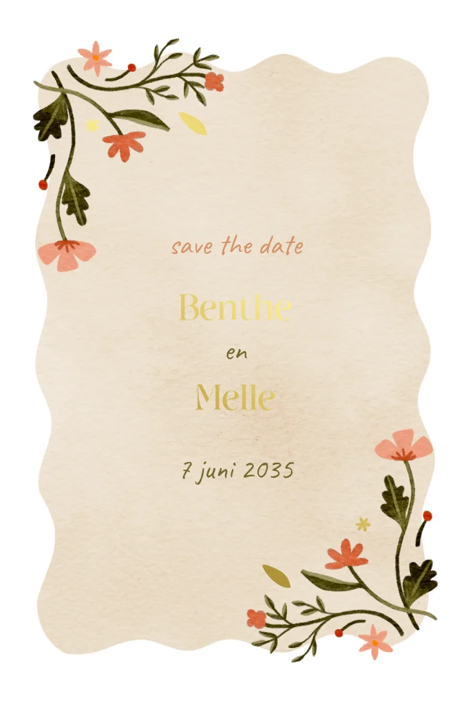 De zachte beige achtergrond en natuurlijke kleuren zorgen voor een rustige uitstraling. De namen en datum staan in een elegante typografie met subtiele goudfolie-accenten.