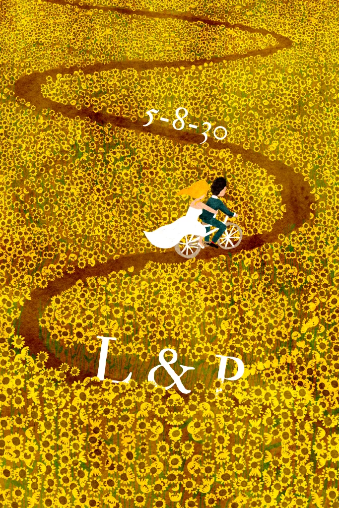Illustratieve trouwkaart met zonnebloemen en bruidspaar