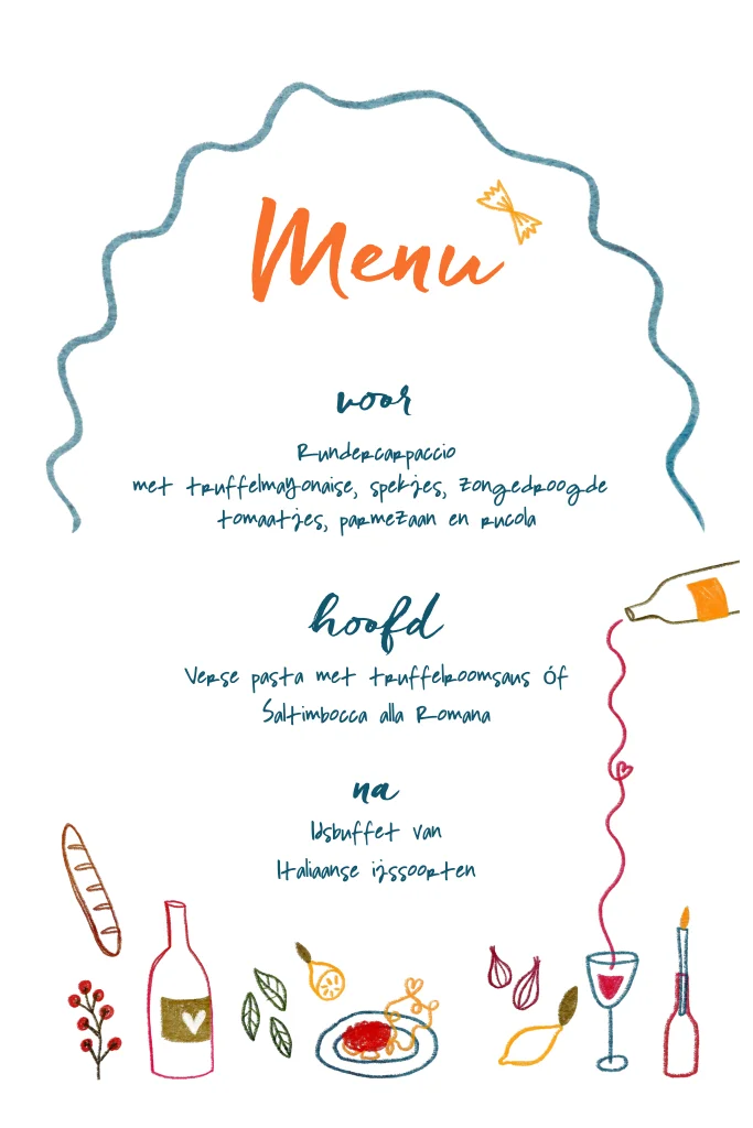Maak jullie Italiaanse bruiloft compleet met deze vrolijke stijlvolle menukaart in dezelfde handgetekende stijl als de trouwkaart en save the date. De kaart is versierd met vrolijke illustraties van wijn, pasta, brood en bloemen en brengt direct de warme, bourgondische sfeer van Italië naar jullie feest.