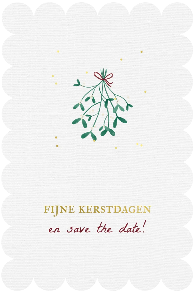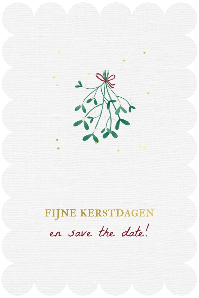 Een originele save the date kaart met een feestelijke kersttouch! Deze kaart met maretak, warme goud- en bordeauxtinten en een speelse geschulpte rand is perfect om te versturen als kerstkaart en save the date in een. Combineer het warme kerstgevoel met een persoonlijke boodschap voor familie en vrienden.