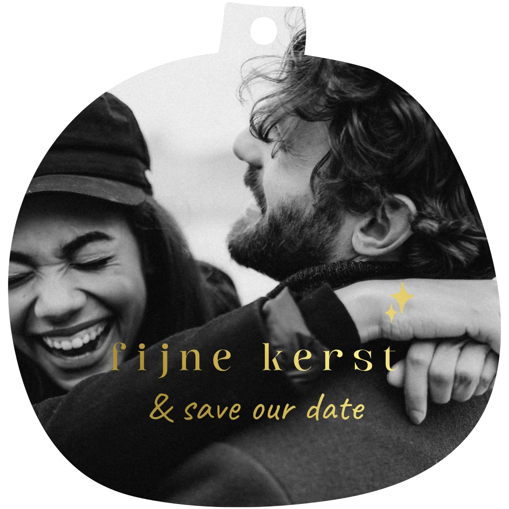 Een originele save the date kerstkaart in de vorm van een kerstbal, perfect om jullie trouwdatum met een vleugje kerstmagie aan te kondigen! De kaart combineert een eigen foto met stijlvolle goudfolie.