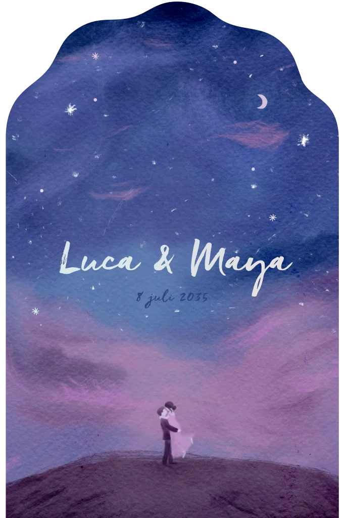 Deze romantische trouwkaart met sterrenhemel is perfect voor stellen die zoeken naar een trouwkaart met illustratie, aquarel trouwkaart of unieke trouwkaart met nachtelijke sfeer. De kaart toont een prachtig geschilderde sterrennacht in paarse en blauwe tinten, met een bruidspaar dat elkaar omhelst. Dankzij de moderne kalligrafie in holografische folie en dromerige uitstraling past deze kaart mooi bij een avondbruiloft, buitenbruiloft of bohemian trouwstijl. Wil je iets aangepast zien aan het portretje? Mail eventjes!
