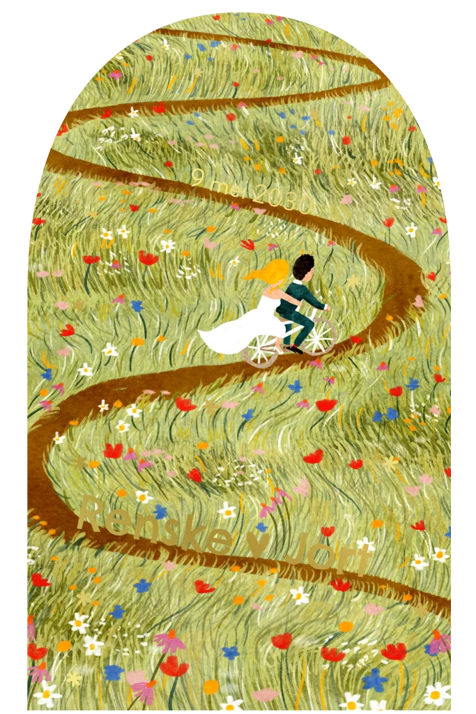 Verras je gasten met deze unieke trouwkaart in boogvorm met illustratie van een bruidspaar op de fiets, rijdend door een veld vol wildbloemen. De slingerende weg, speelse details en warme kleuren zorgen voor een romantische en dromerige sfeer. Voeg eenvoudig jullie namen, trouwdatum en persoonlijke tekst toe om zo de kaart helemaal naar wens aan te passen.