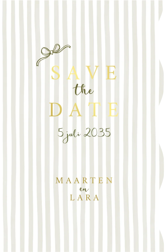 Deze stijlvolle save the date kaart met golfrand aan de zijkant en minimalistisch streepjes patroon is de perfecte aankondiging voor jullie bruiloft. Deze Save the date past prachtig bij de bijpassende trouwkaart met golfrand en geeft een mooi voorproefje van de uitnodiging. Pas de kaart helemaal naar wens aan. Hulp nodig? Mail even!