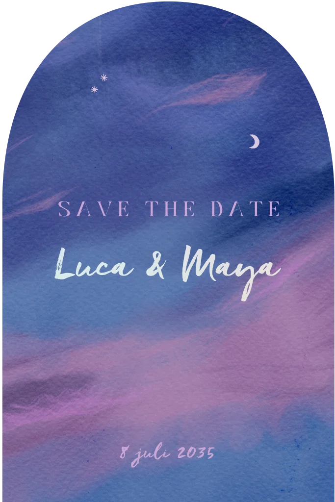 Deze romantische Save the Date kaart met blauw-paarse aquarelhemel past prachtig bij een trouwkaart in dezelfde stijl. Met subtiele details zoals een maantje, zachte sterren en elegante typografie vormt deze kaart een sfeervolle voorproef van jullie bruiloftsdrukwerk. Het ontwerp houdt de verrassing nog even vast, maar sluit qua kleurenpalet en vormgeving perfect aan op jullie trouwkaart.