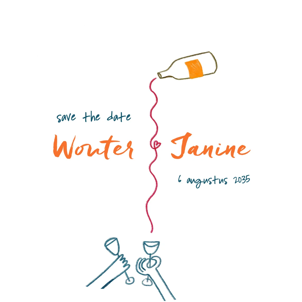 Verras jullie gasten met deze vrolijke save the date kaart vol speelse handgetekende illustraties. Het ontwerp toont een wijnfles waaruit een sierlijke lijn met hartje stroomt, richting twee glazen die klinken op de liefde. Een originele en stijlvolle manier om jullie trouwdatum alvast aan te kondigen.