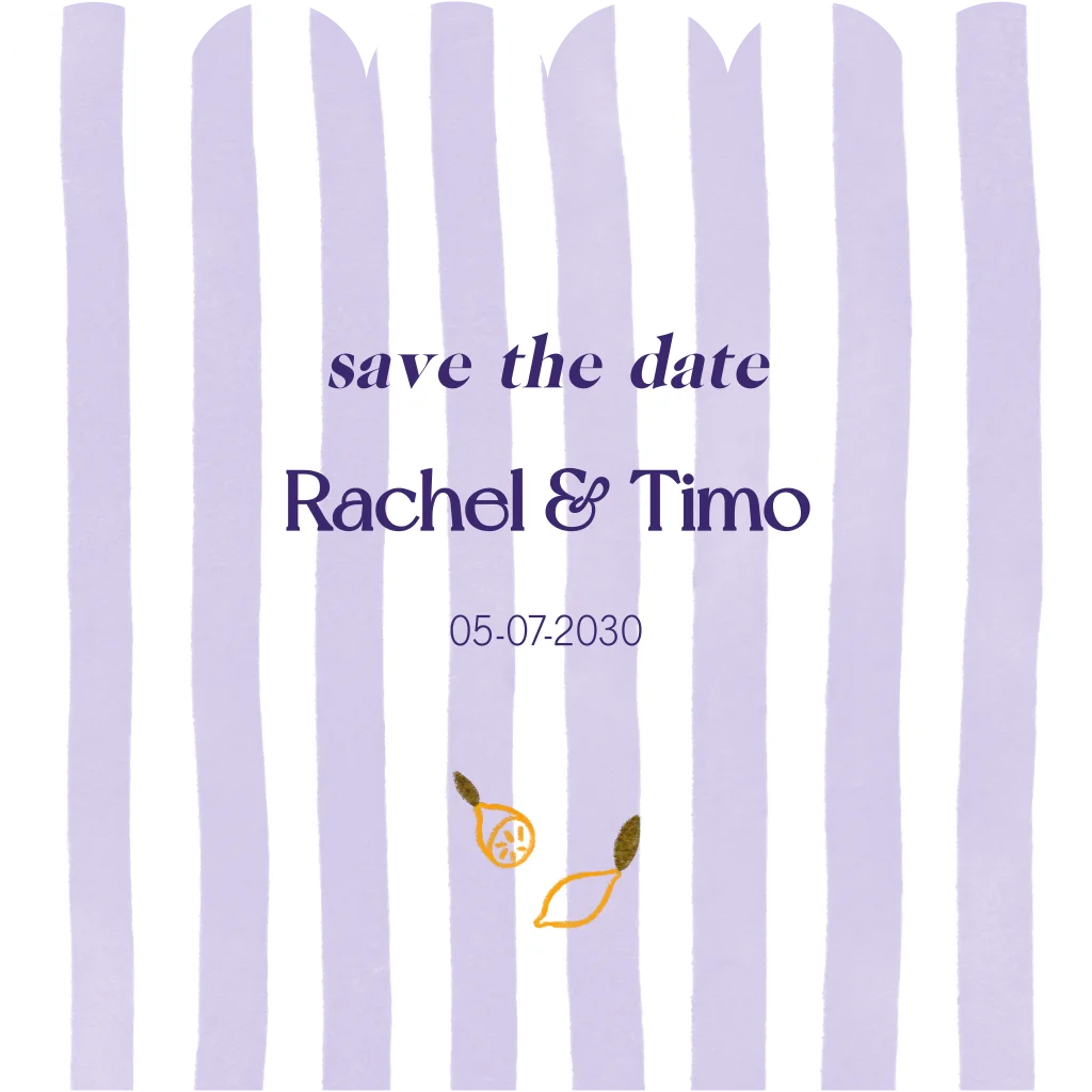 Een stijlvolle save the date kaart met lavendelstrepen en subtiele citroenillustratie. Deze kaart vormt een perfect duo met de bijpassende trouwkaart in lavendel en honinggeel. De ronde scallop bovenrand en het elegante lettertype geven het ontwerp een speelse en moderne uitstraling. Perfect voor een zomerse bruiloft met een mediterrane touch.