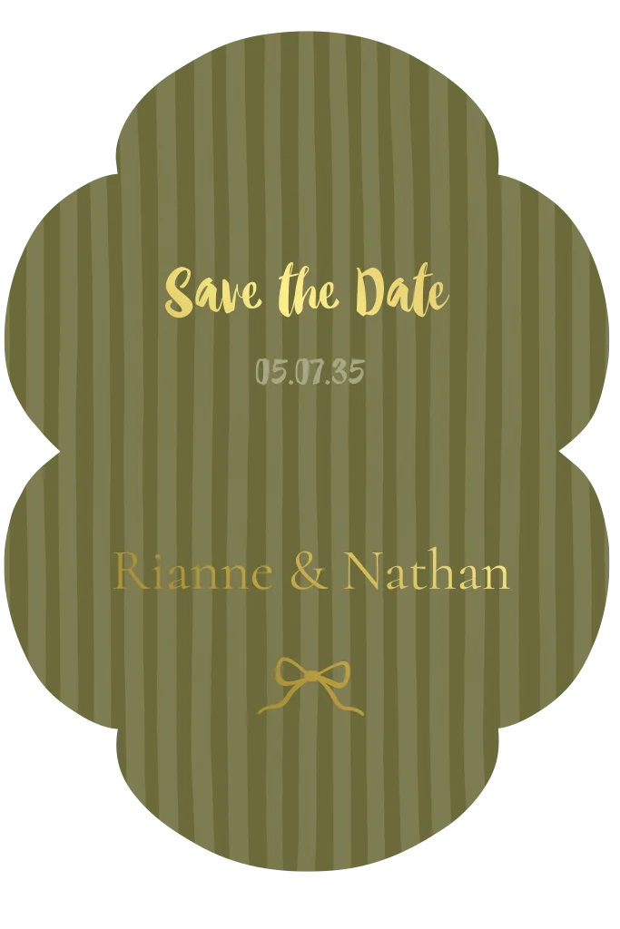 Deze stijlvolle save the date kaart met scallop rand en vintage ontwerp met streepjes is de perfecte aankondiging voor jullie bruiloft. Het ontwerp combineert trendy olijfgroen met goudfolie.