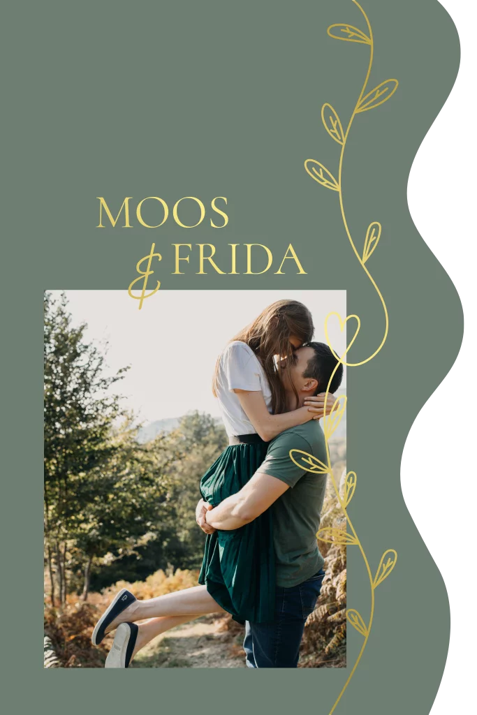 Een bijzondere romantische trouwkaart met een golvende rand en een goudfolie lijntje met blaadjes en een hartje. Het combineert prachtig met een foto!