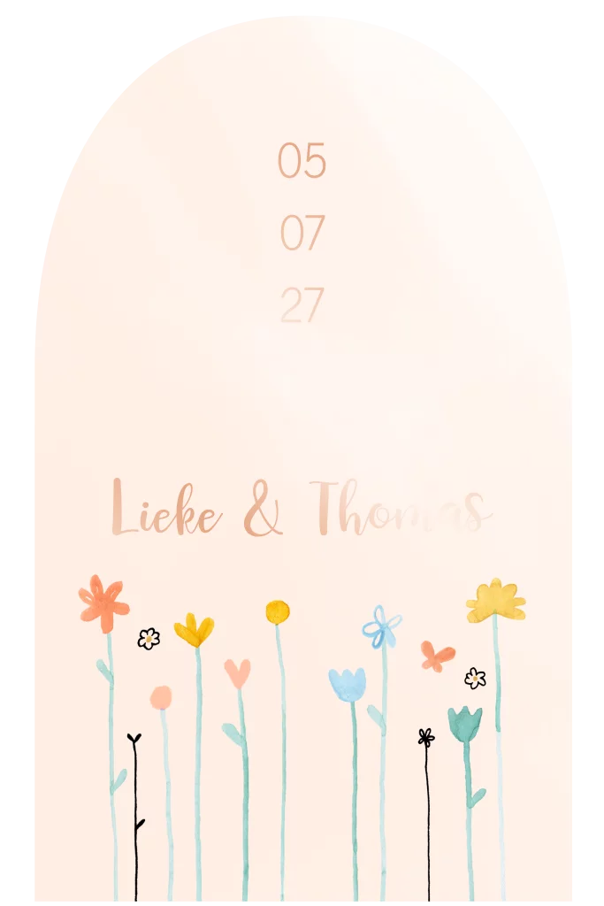 Trouwkaart bloemetjes boog roségoudfolie
