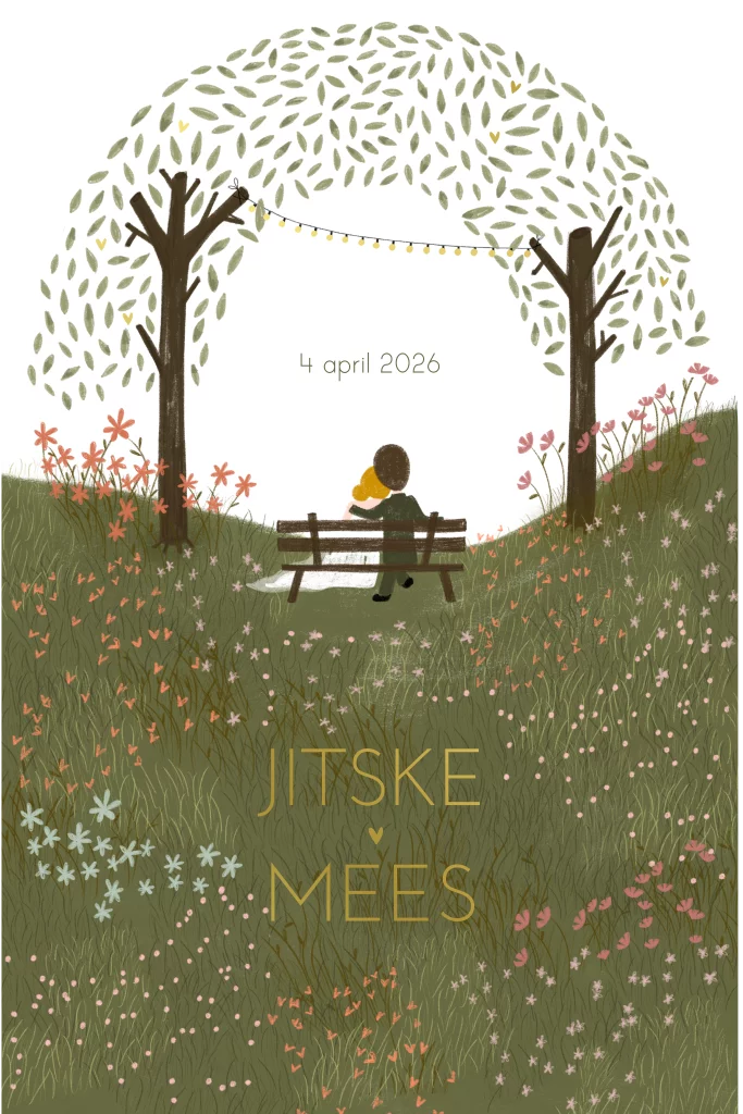 Een geïllustreerde romantische trouwkaart in de vorm van een boog met een bruidspaar tussen de bloemen. De goudfolie op de kaart maakt het extra chique! Pas de kleur aan van alle bloemetjes en het bruidspaar naar wens door op het elementje te klikken en daarna naar het kleurenpalletje te gaan.