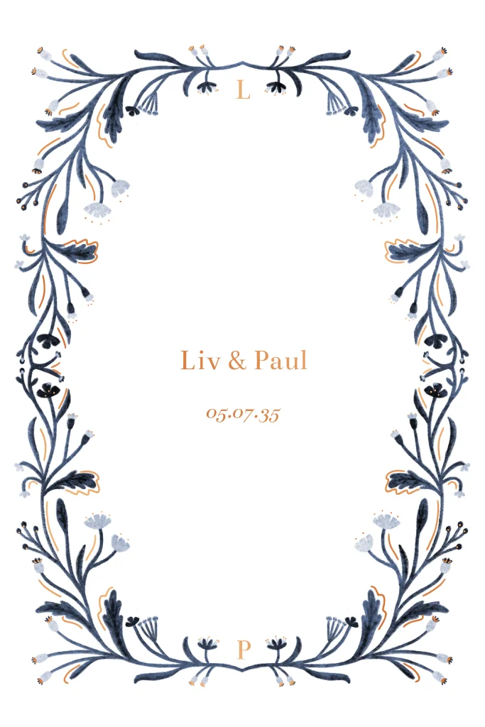 Stijlvolle trouwkaart met een sierlijk botanisch bloemenkader in diepe blauwtinten en subtiele koperaccenten. De namen en datum worden gedrukt in luxe koperfolie, wat zorgt voor een warme, elegante glans. Perfect voor een romantische bruiloft. Deze trouwkaart met koperfolie combineert verfijnde details met een tijdloos ontwerp en geeft jullie aankondiging een unieke, chique uitstraling. Een andere kleursamenstelling? Mail even!