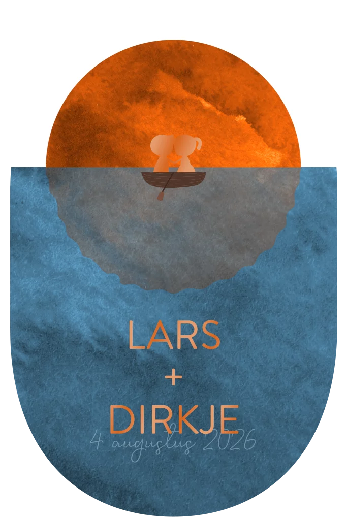 Een avontuurlijke unieke trouwkaart met een zonsondergang, een huwelijksbootje en een bruidspaartje in hoogglans. Kies zelf een andere samenstelling bruidspaartje tussen de silhouetjes in de editor!