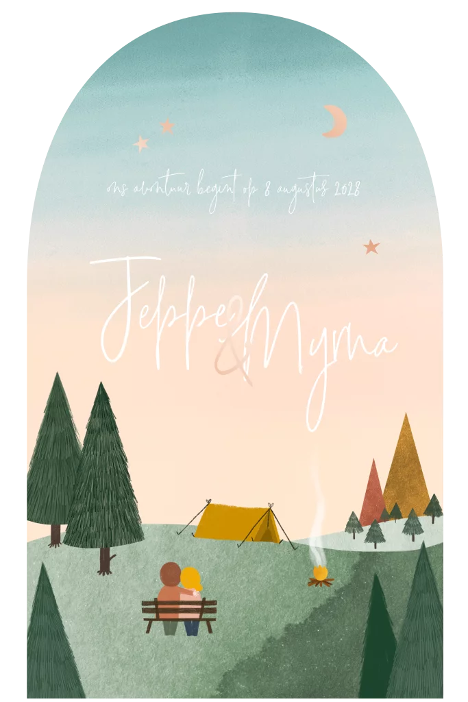 Deze trouwkaart heeft een hippe boogvorm en is geïllustreerd met een waterverf landschap met kampeer elementjes zoals een schattig tentje en een verliefd bruidspaar wat naar de sterrenhemel kijkt.