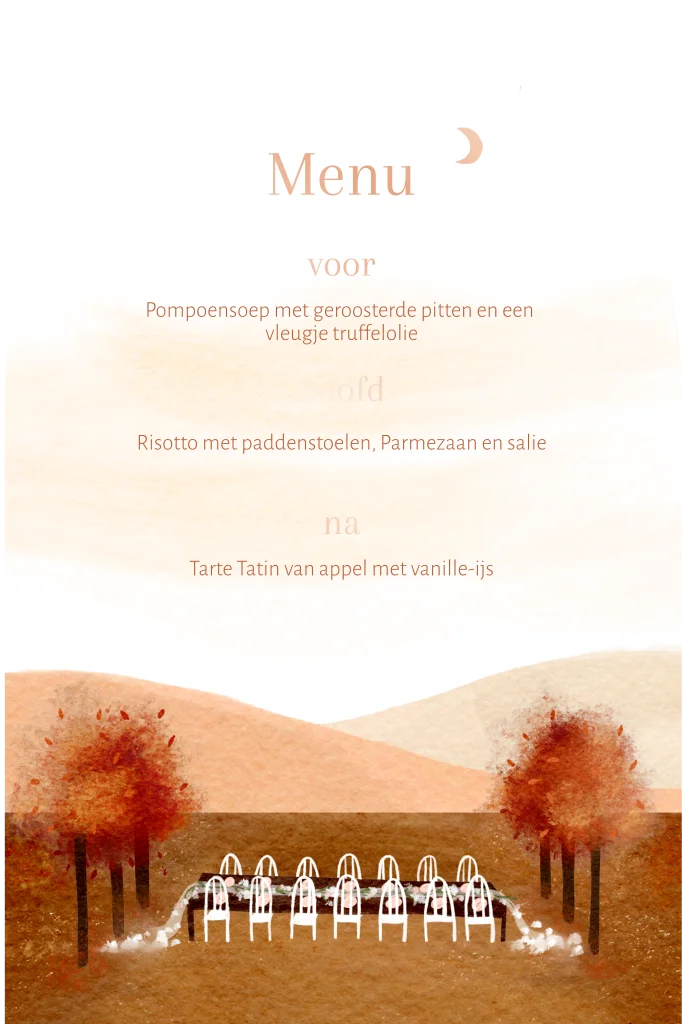 Een stijlvolle menukaart in warme herfstkleuren, prachtig passend bij de trouwkaart uit dezelfde collectie. De zachte aquarel-achtergrond en elegante typografie geven een romantische uitstraling. Perfect voor een diner vol seizoenssmaken tijdens jullie herfstbruiloft.