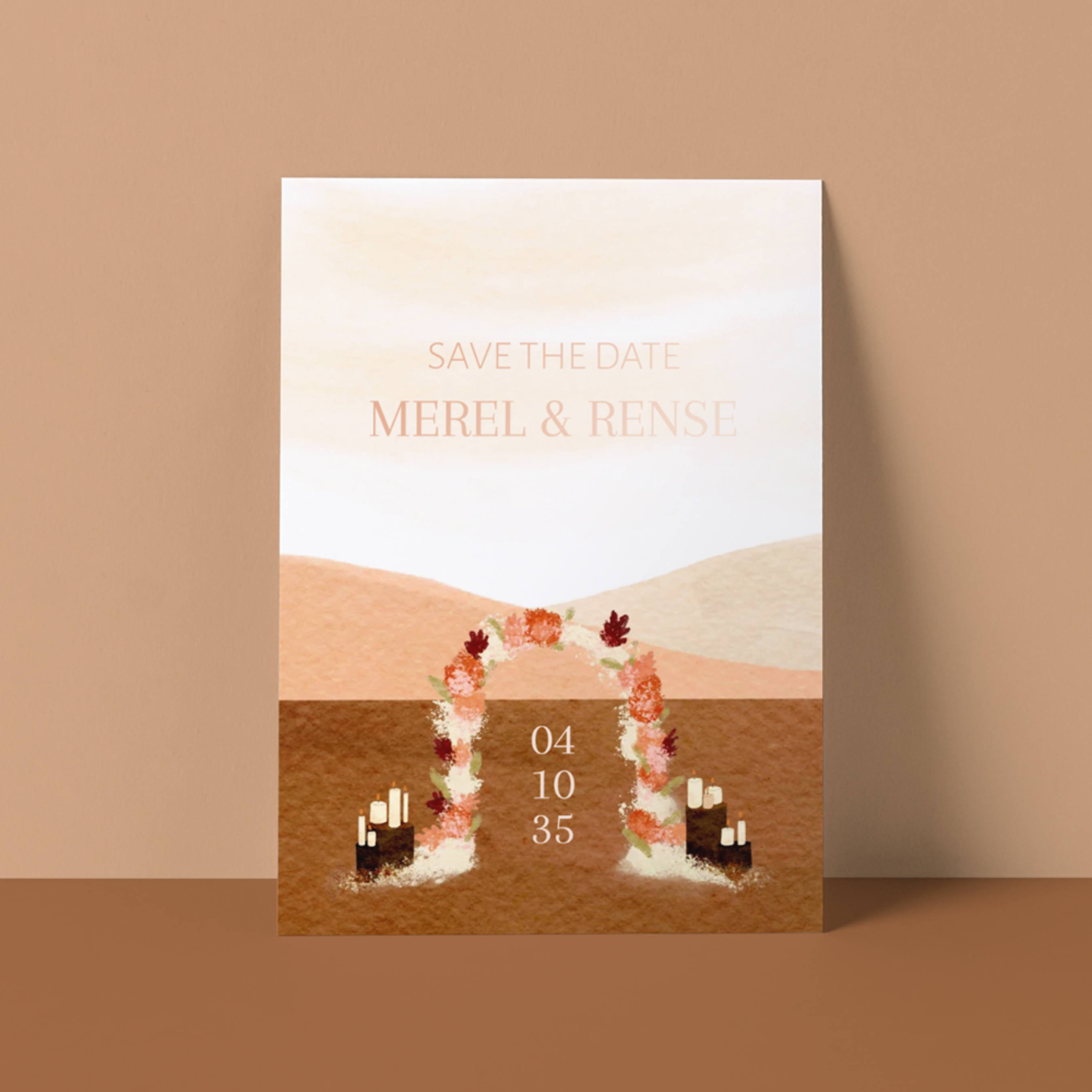 Een stijlvolle save the date-kaart in warme herfstkleuren, met een aquarel bloemenboog en zachte tinten bruin, koper en blush. De natuurlijke illustratie en minimalistische opmaak geven deze kaart een romantische en warme uitstraling.