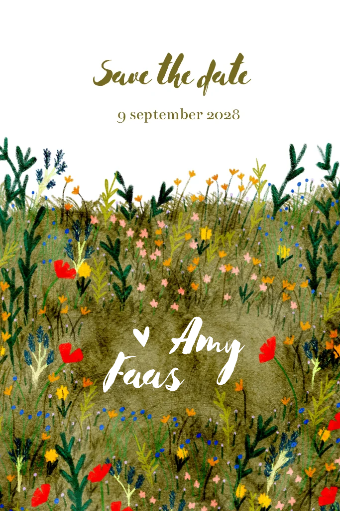 Deze lieve save the date kaart toont een vrolijke bloemenweide in aquarelstijl, met mooie groentinten en klaprozen als detail.